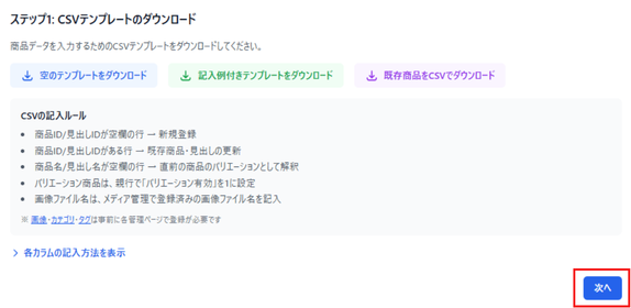 記入例を参考にすれば、初めてでも迷わず入力できます。 - 既存商品をCSVで書き出して一括更新できる