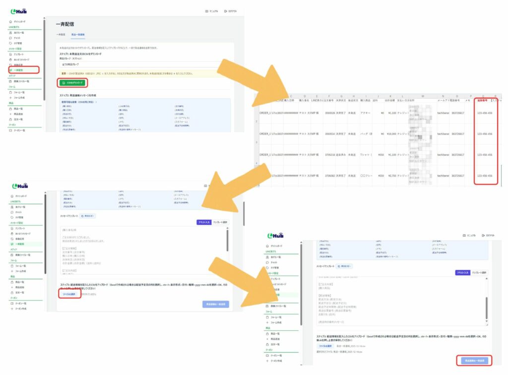 そんな悩みを一発解決!LHubの新機能により、発送リストをCSVでダウンロード→追跡番号を追加→アップロードするだけで、お客様への配送通知が自動で一斉送信されます。100件でも1000件でも、作業時間はわずか数分。配送業務の効率が劇的に向上します。