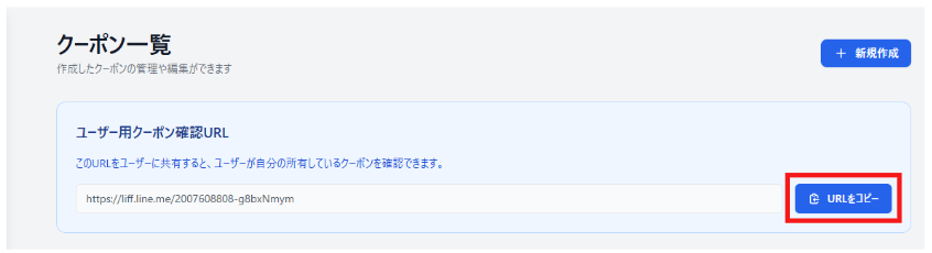 ここでは、配布したクーポンをお客様に確認していただく手順について説明します。 クーポン一覧の「ユーザー用クーポン確認URL」の[URLをコピー]を押します。 送信したい友だちにチャットの[テキスト入力]を押し、テキストボックスにURLをコピーします。[送信]を押します。 URLを受け取った友だちは、URLをタップして確認します。 目次に戻る