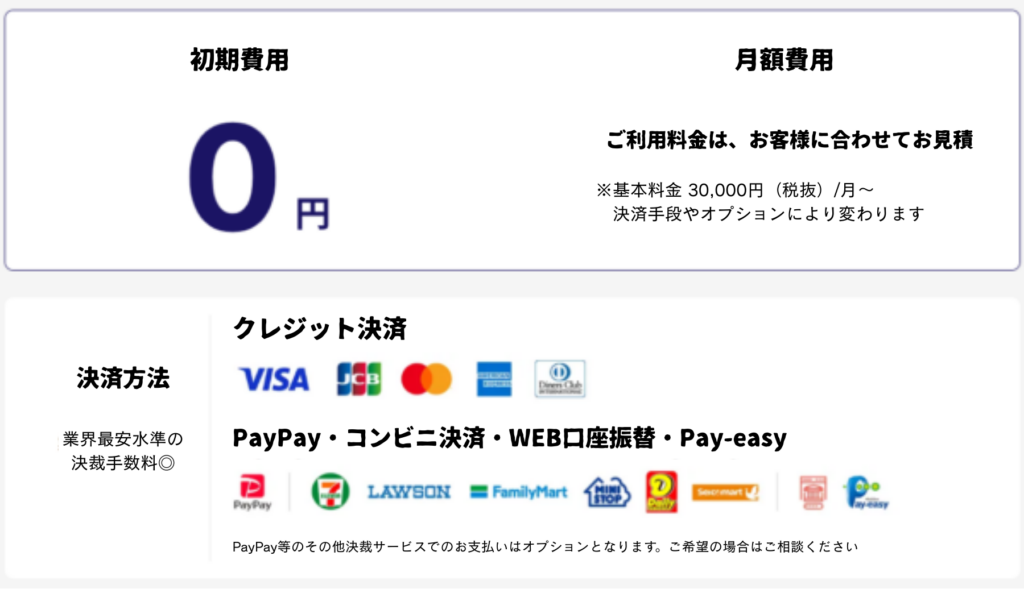 | 別途サービス利用料は発生しますか? いいえ、他社サービスのような追加のサービス利用料は一切発生しません。発生するのは「月額費用」と「決済手数料」のみです。 |