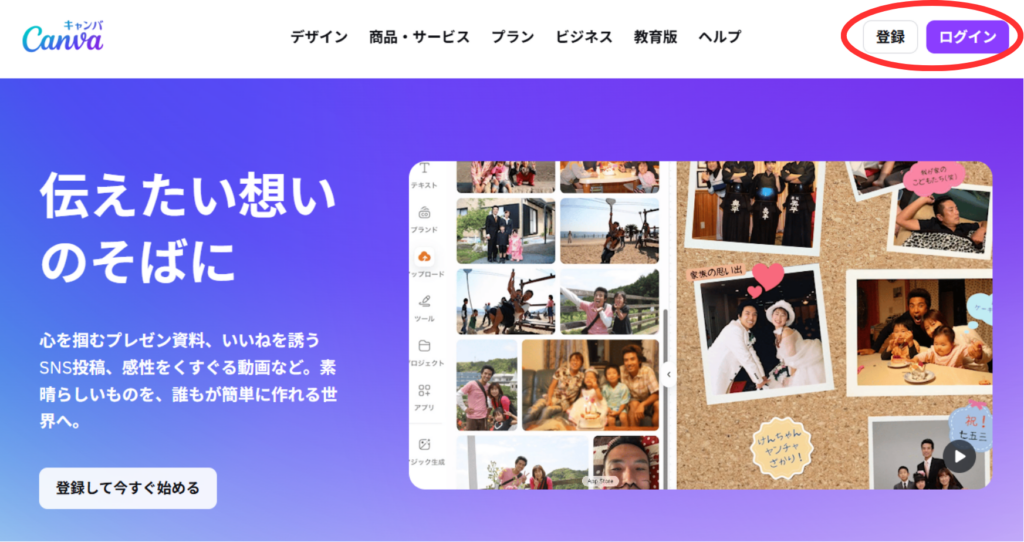 - 「Canva」(https://www.canva.com/ja_jp/)にログインします。(アカウントが未登録の場合は、登録してください。)