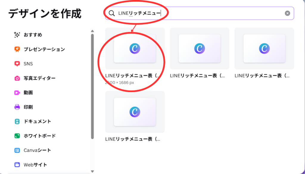 - 赤枠に「LINEリッチメニュー」と入力して表示される検索結果を押します。