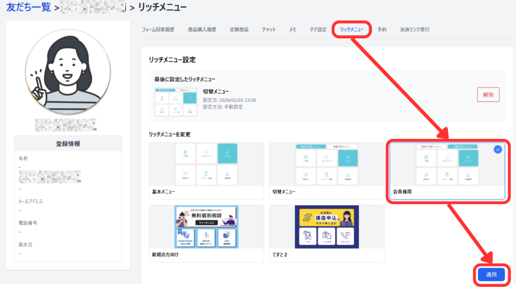友だちの1アカウント毎に、個別のメニューを表示することができます