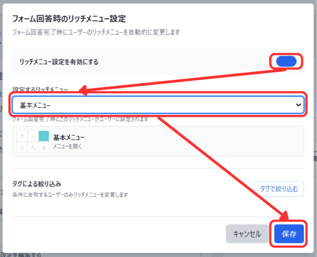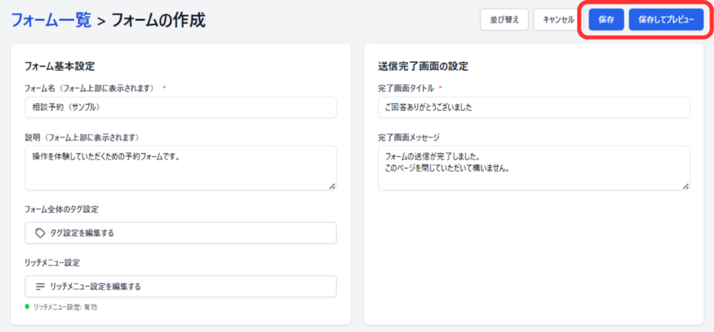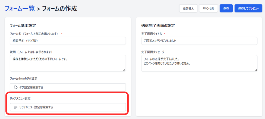 フォーム回答完了時に、設定したメニューを表示することができます