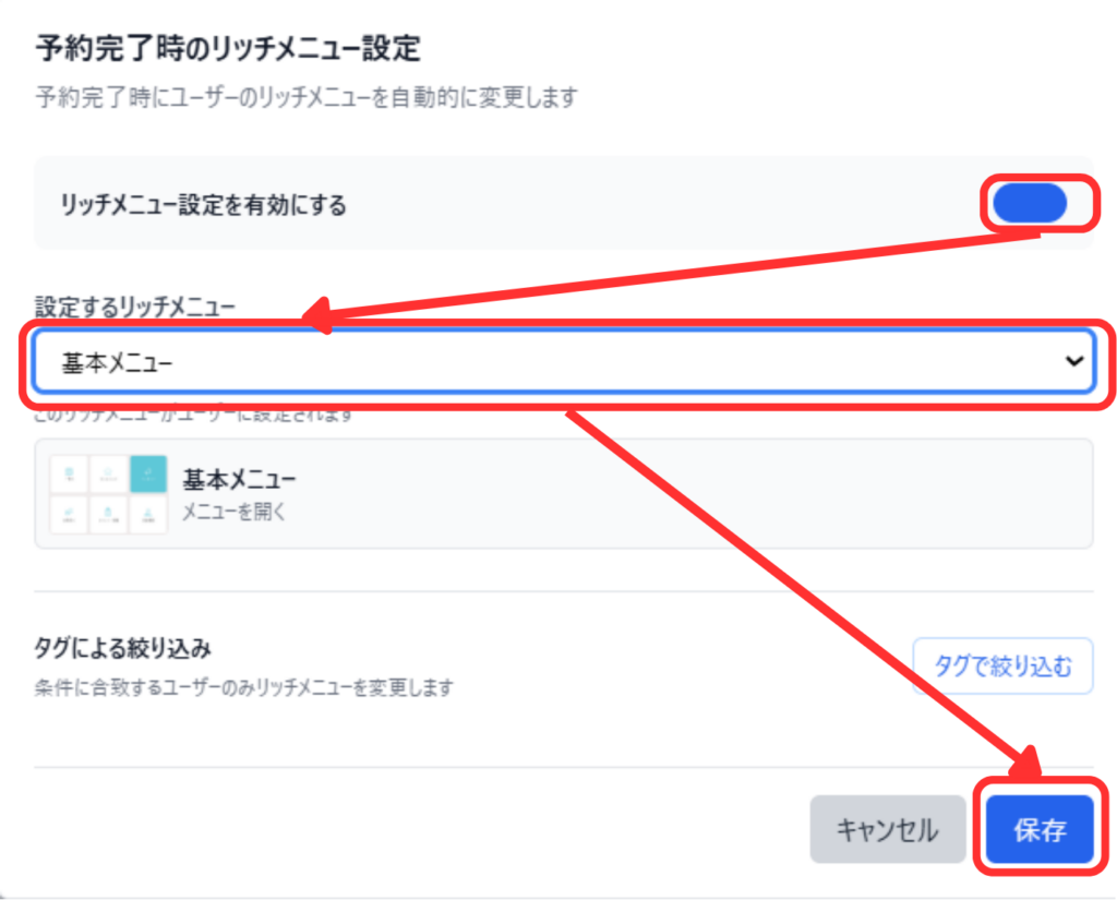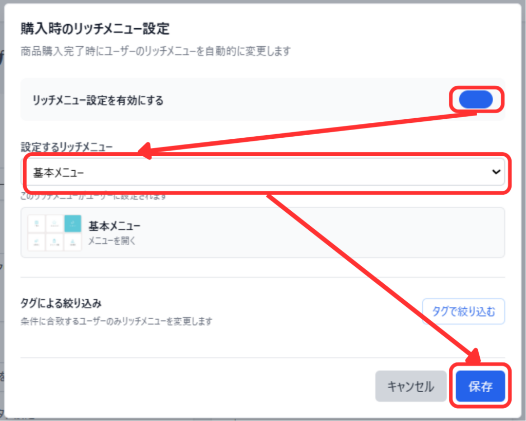 商品の購入完了時にユーザーのリッチメニューを設定したメニューに変更できます。